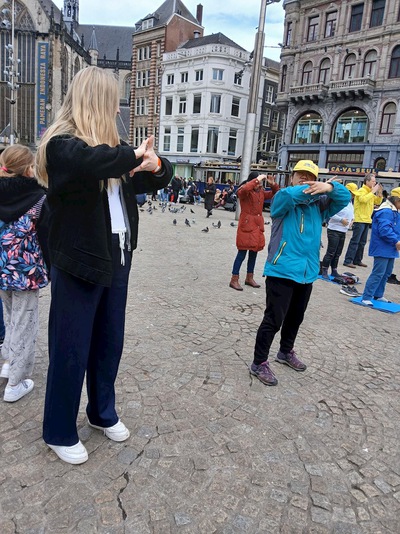 Praktisi di Belanda memperagakan latihan Falun Dafa di Dam Square di Amsterdam.